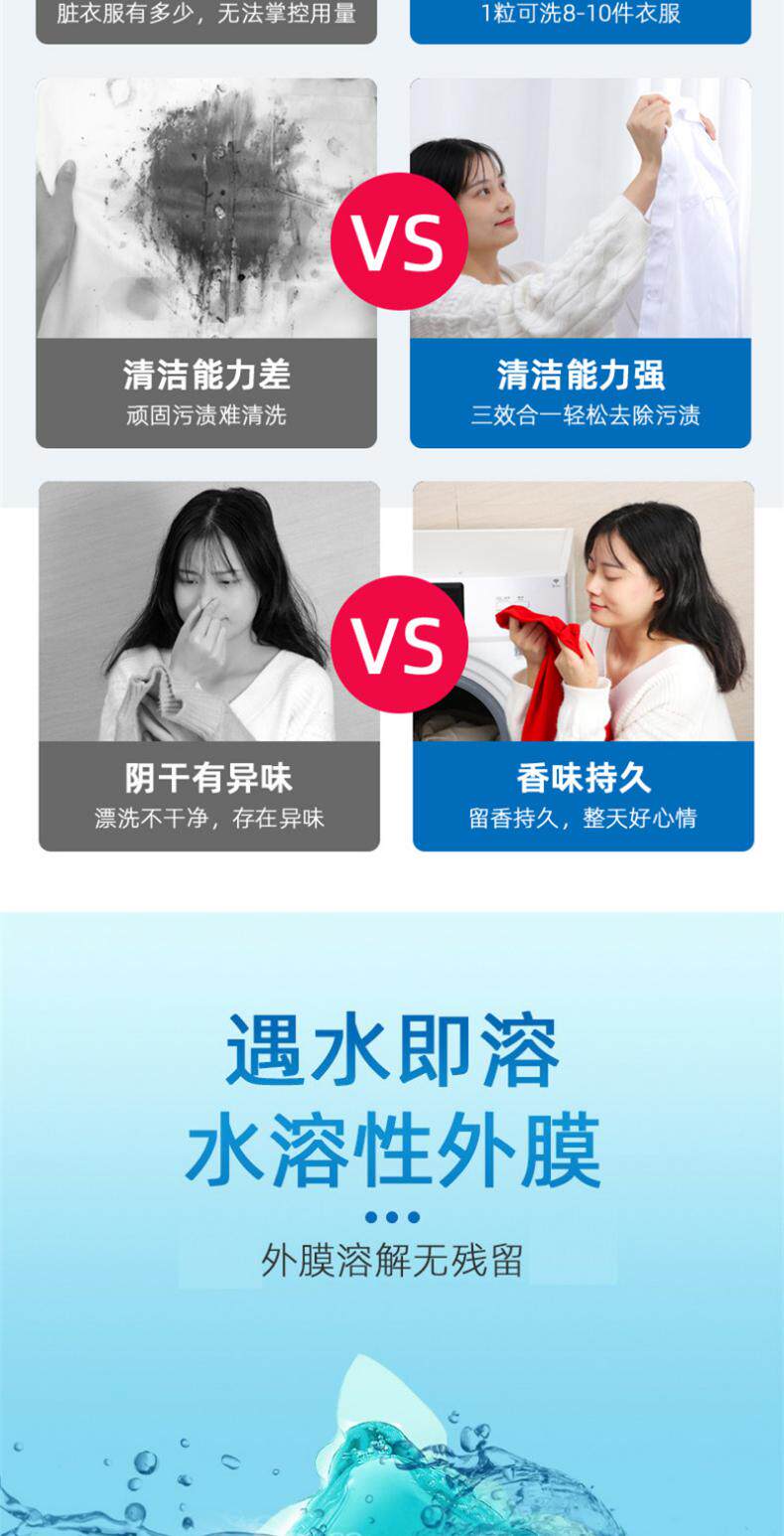 遇水即溶,水溶性外膜,外膜溶解无残留,浓缩配方三合一,洗衣不繁琐,8倍洁净力,去污能力强,1粒可洗8-10件,易漂清无残留,呵护全家衣物健康。