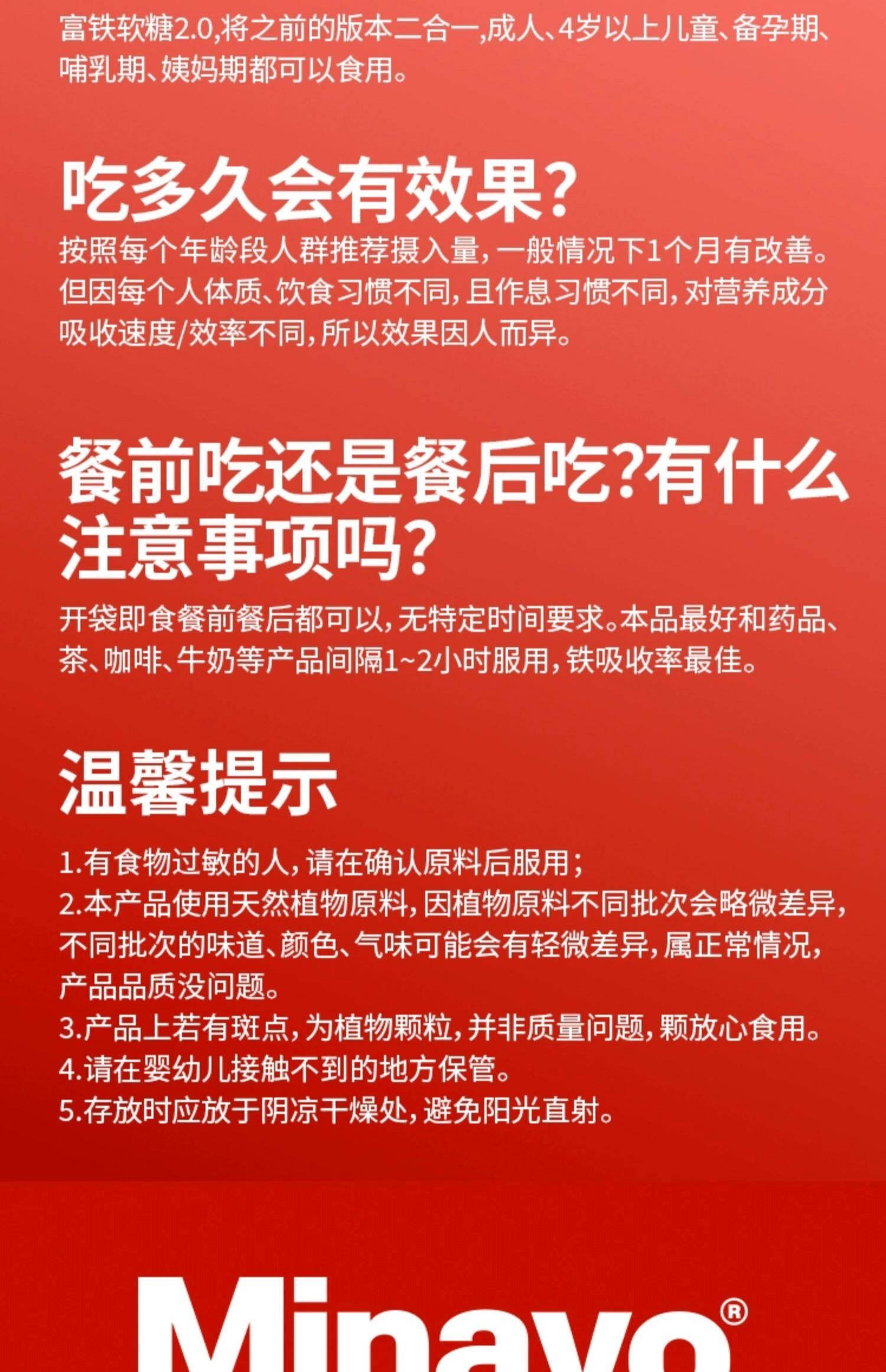 minayo富铁补铁软糖补精气神女人姨妈贫血神器补维C。好吃的富铁软糖,嚼出红润好气色。低卡无负担,无色素香精才安心,独立包装的,携带超级方便【赠运费险】